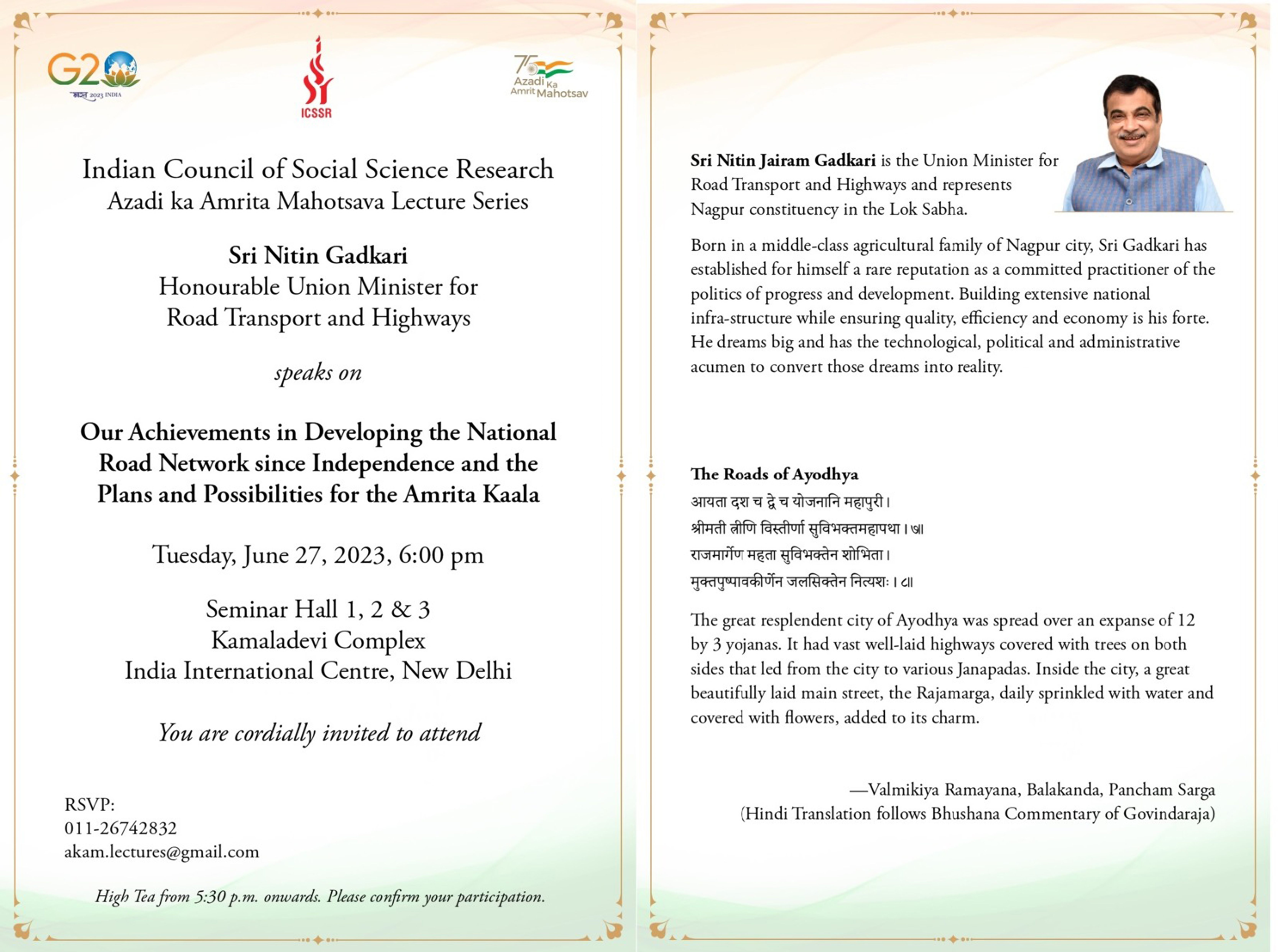 In this series, the ICSSR is going to organize the eighth Lecture to be delivered by Sri Nitin Gadkari Ji, Honourable Union Minister for Road Transport and Highways on the topic “Our Achievements in Developing the National Road Network since Independence and the Plans and Possibilities for the Amrita Kala” on 27th June 2023 at 5:30 pm in the Seminar Hall 1, 2&3, Kamaladevi Complex, India International Centre, New Delhi.