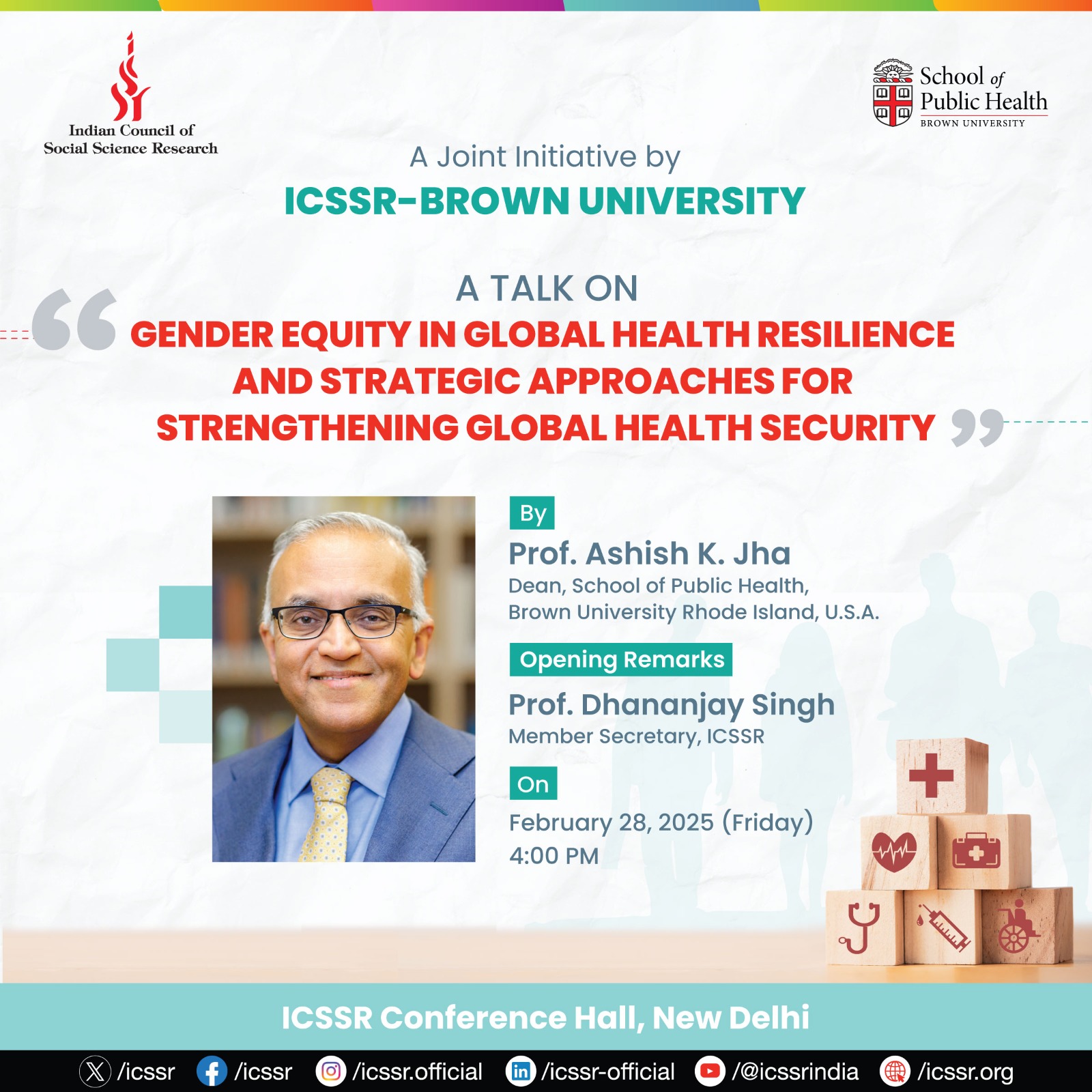 A Talk on "Gender Equity in Global Health Resilience and Strategic Approaches for Strengthening Global Health Security" by Prof. Ashish K. Jha, Dean School of Public Health, Brown University Rhode Island, USA on February 28, 2025, 4:00 PM at ICSSR Conference Hall, New Delhi